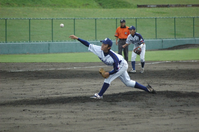 先頭を左中間方向のヒットで出塁させてしまい、0アウト1塁とすると、ここで左のエース飯田が登板。